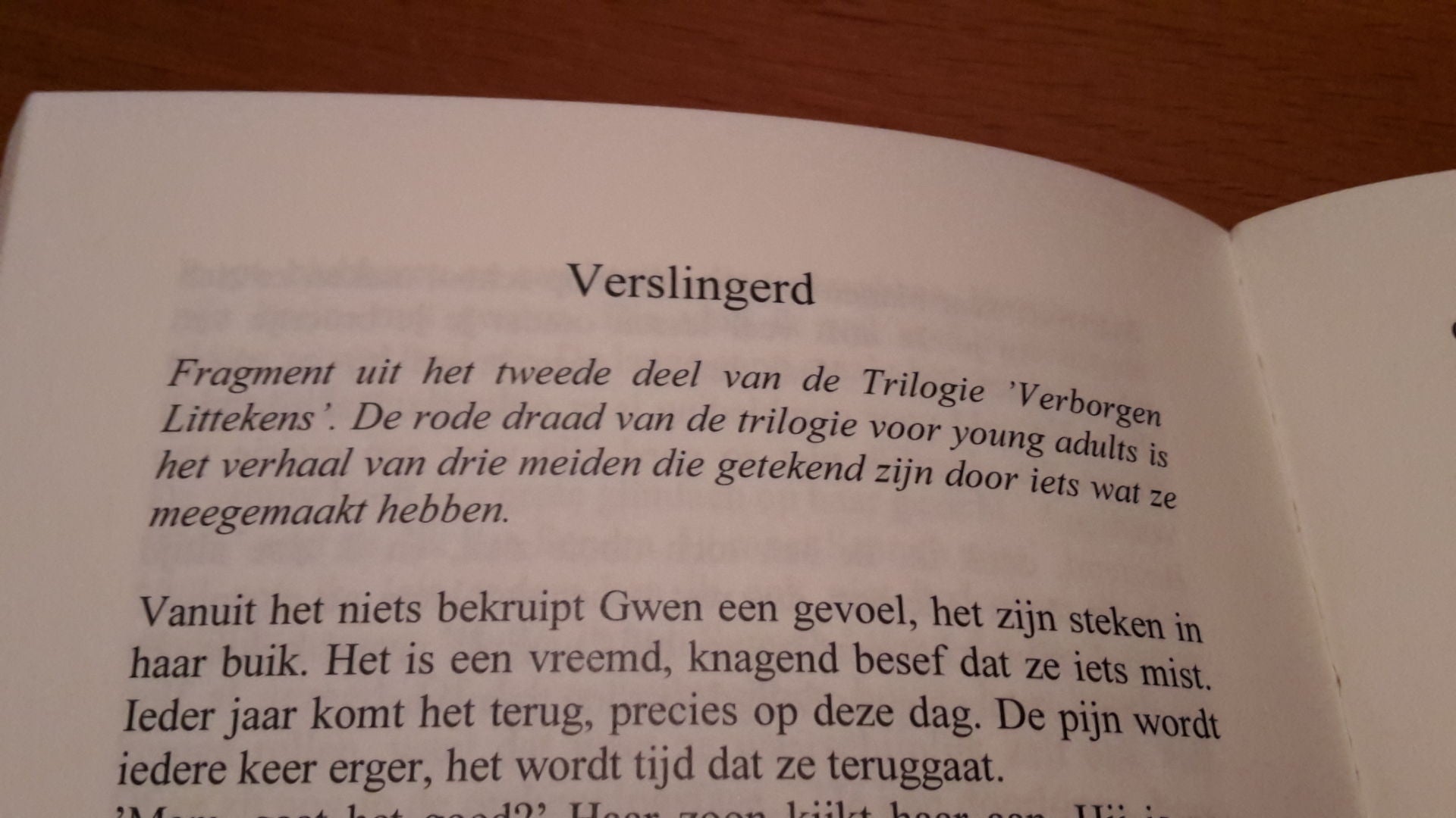 Speciaal voor dit boek heb ik het eerste hoofdstuk van 'Verslingerd' uitgekozen. Dus als je alvast een voorproefje van het tweede deel van de trilogie 'Verborgen Littekens' wilt lezen, dan kan je 'Loswerk' kopen.